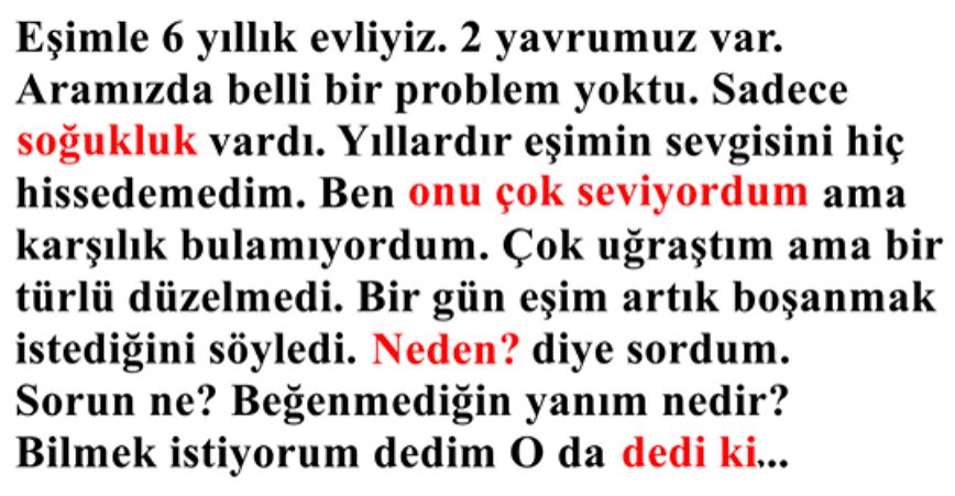 Çok uğraştım ama bir türlü düzelmedi. Bir gün e-şim artık boşanmak istediğini söyledi. “Neden diye sordum. Sorun ne? Beğenmediğin yanım nedir? Bilmek istiyorum” “Bilmiyorum” dedi. “İçimde anlam veremediğim bir soğukluk var sanki.