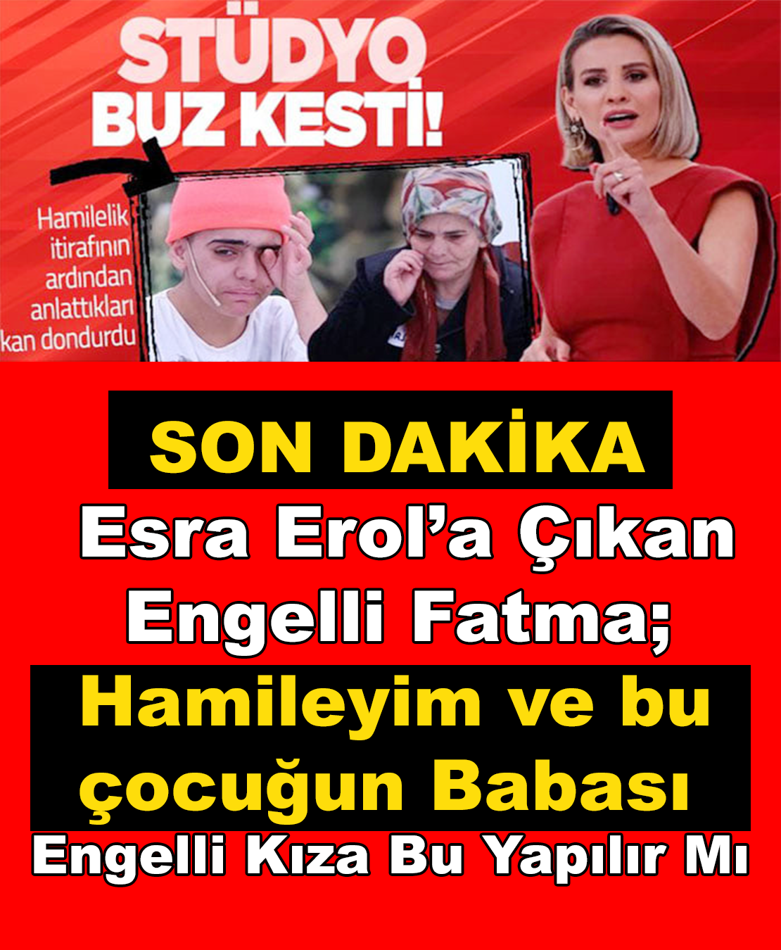 Zihinsel engelli Fatma’nın dramı bitmiyor! Hamile ama bebeğin babasının kim olduğunu bilmiyor!”AHMET VE KAYINVALİDEM BENİ DÖVDÜ”Saçları kazınan Fatma, Esra Erol’un “Saçlarını bu hale kim getirdi?” sorusu üzerine de sözlerine şöyle devam etti: “Kayınvalidem ve Ahmet. Ahmet’in Gülşen’le olan birlikteliğinden doğan çocukları devlet korumaya aldı, onlar da beni suçluyorlar. Saçlarımı keserken elimi kolumu bağladılar. Şiddet gördüm.”