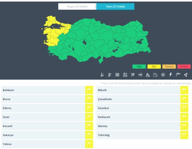 Meteoroloji’nin MeteoUyarı sistemine göre 13 il için sarı uyarı yayınlandı. Balıkesir, Bilecik, Bursa, Çanakkale, Edirne, İstanbul, İzmir, Kırklareli, Kocaeli, Manisa, Sakarya, Tekirdağ ve Yalova için yayınlanan sarı uyarıda bu illerde rüzgarın etkili olacağı kaydedildi.